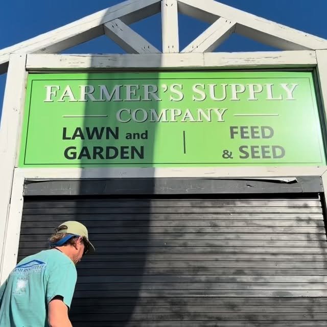 A signboard for Farmer's Supply Company, offering lawn, garden, feed, and seed products. It features a humorous message: "Lettuce turnip the beet."
