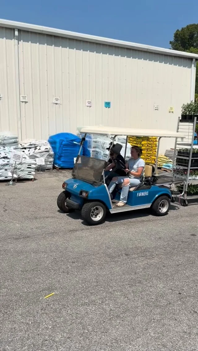 A blue vehicle with the word "FARMERS" written on the side, carrying potted orange flowers and gardening supplies.