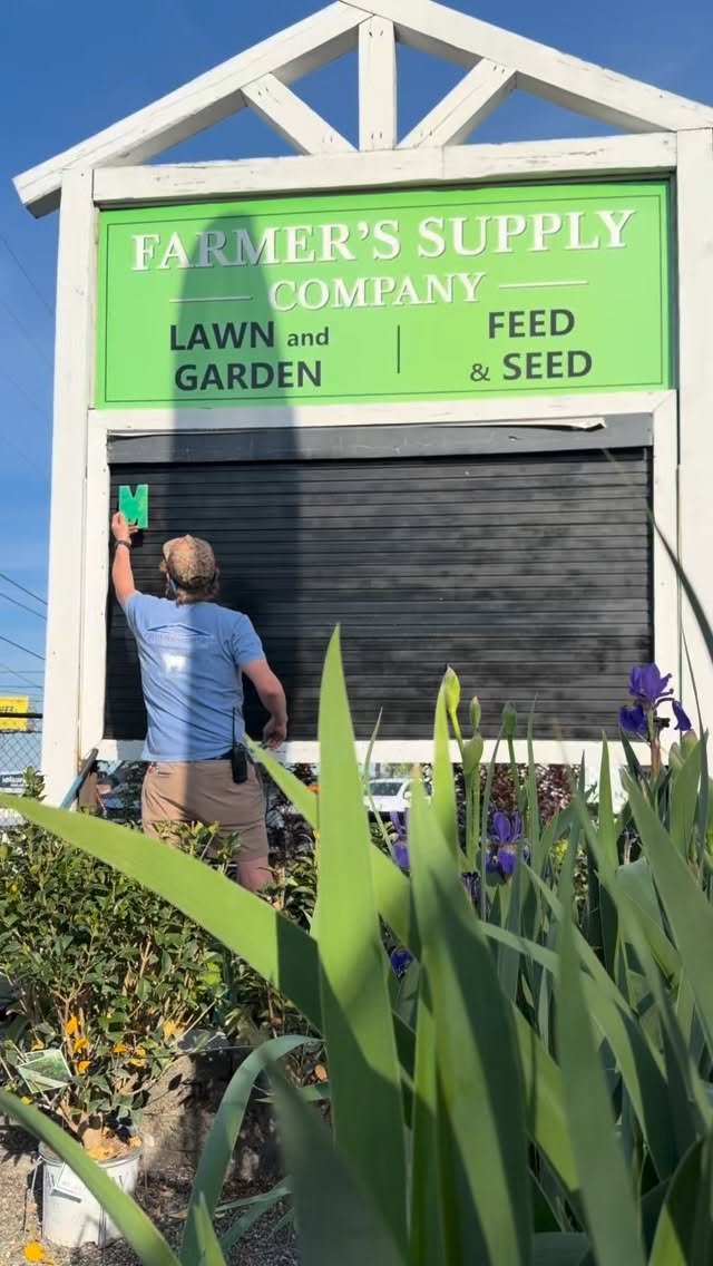 Green and white sign for Farmer's Supply Company with words LAWN and GARDEN, FEED & SEED, and a message board reading 'TIME TO PLANT' surrounded by plants, flowers, and outdoor plants with a blue sky in the background.